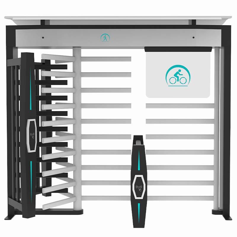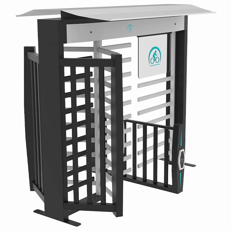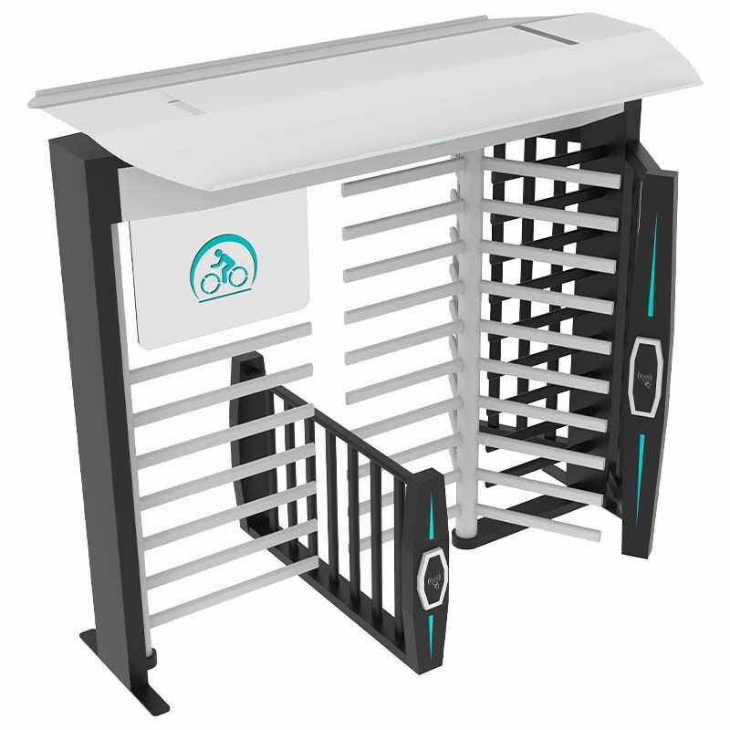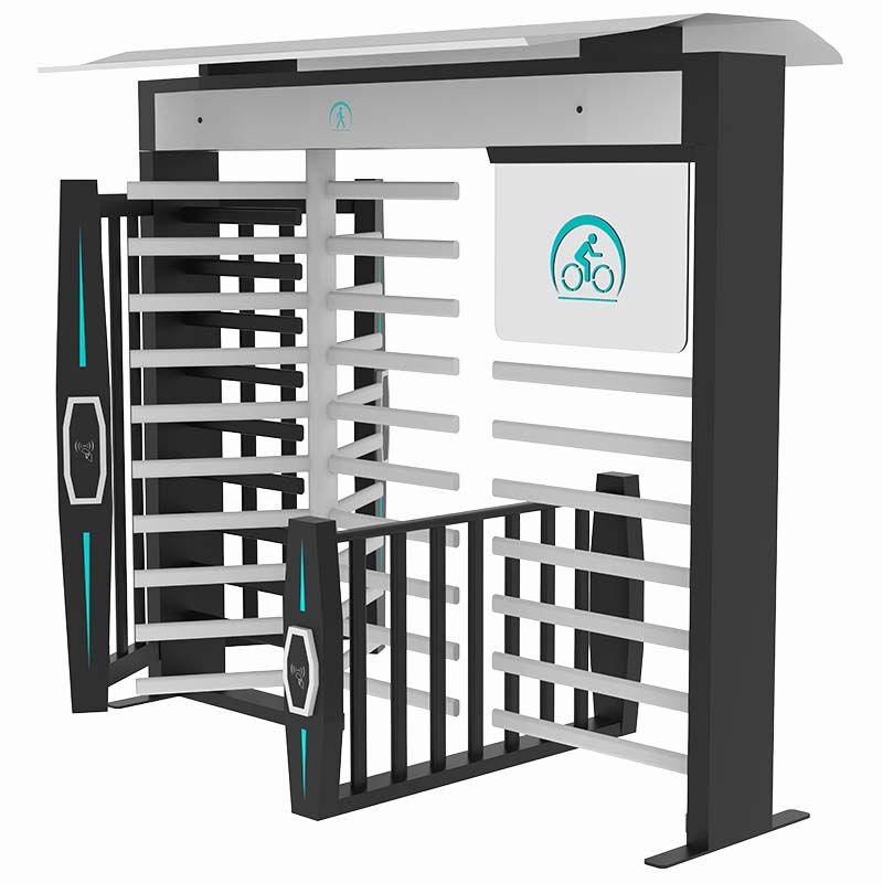 Bicycle turnstile is a kind of full height turnstile equipment specially designed for pedestrians and bicycles. Pedestrians can pass safely with bicycles. Pedestrians can also pass alone. It integrates the pedestrian passage and bicycle passage. After the pedestrian provides the legal door opening signal, the pedestrian turnstile blocking rod rotates a certain angle to the door opening direction to prompt the pedestrian to pass. The bicycle passage blocking rod rotates 120 degrees to be open. After the pedestrian gently pushes the pedestrian passage blocking rod, the pedestrian passage blocking rod automatically rotates to the door opening direction. The chassis and rotating blocking rod adopt a removable structure, which is convenient for installation and transportation.